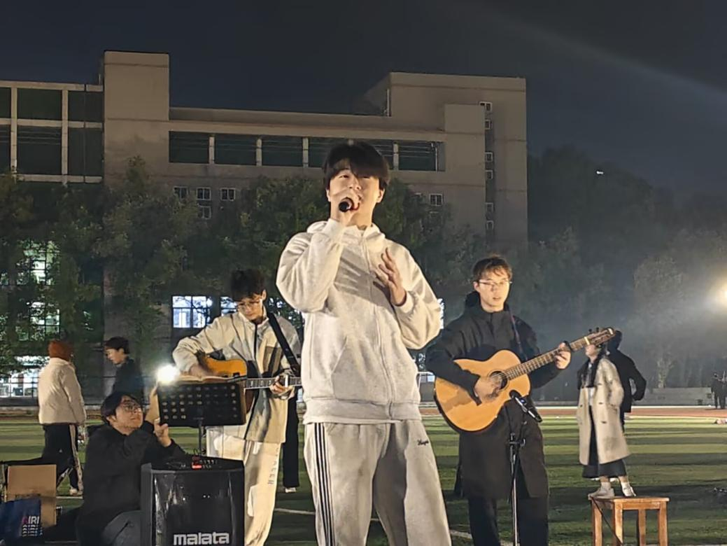 音乐会在不晚乐队热血激昂的《天下》中拉开帷幕,主唱的暖心问候瞬间点燃现场氛围。随后,高材12402班王浩学长带来独唱《姑娘你》,将青春炽热的心动藏于歌词和节奏。兼职辅导员付涛老师登台致辞为新生送上真挚祝福与殷切期望,并正式宣布音乐会启动。