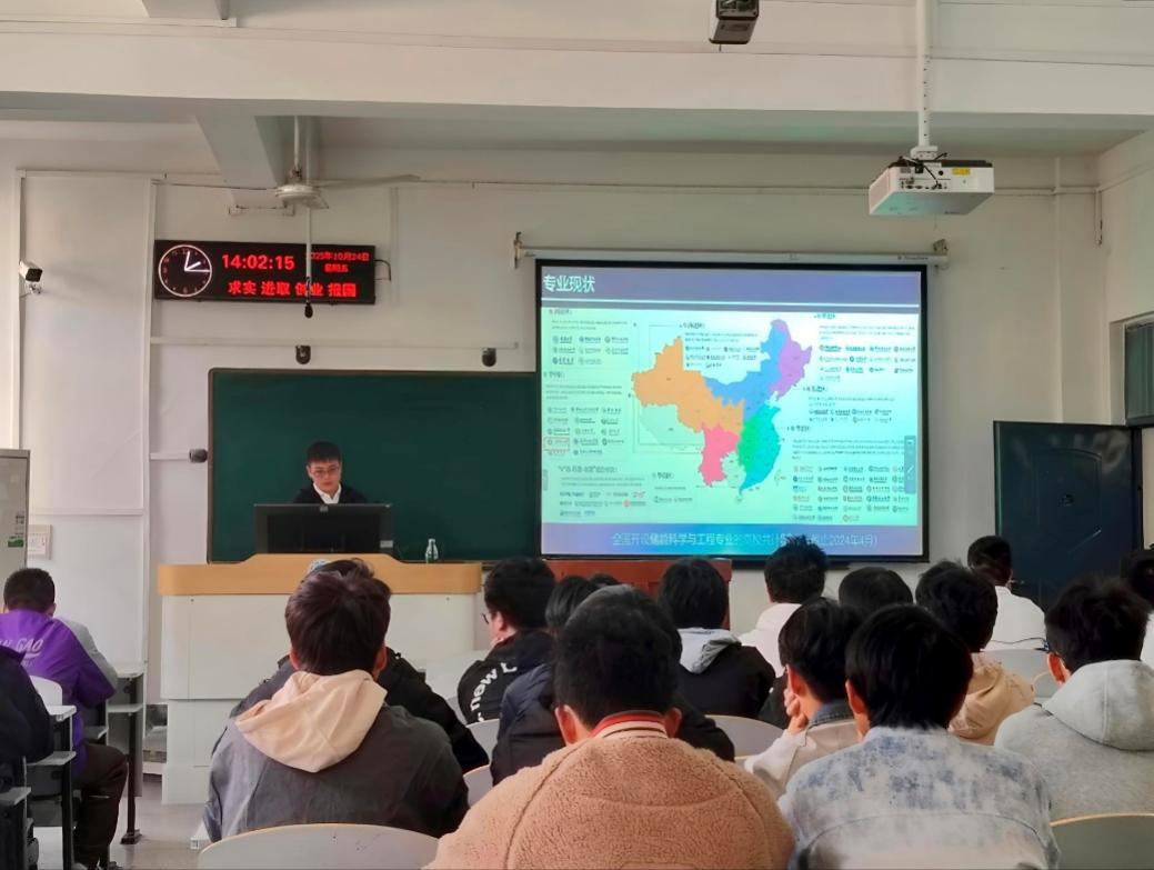 10月24日,储能科学与工程系副主任李国成老师率先开讲,围绕国家“双碳”目标与能源安全需求,深入介绍了储能科学与工程专业的建设现状与发展前景。他重点聚焦电化学储能、氢能等前沿方向,系统讲解了专业师资队伍、研究方向及人才培养体系,引导学生从国家战略高度理解专业价值,激发学习热情。