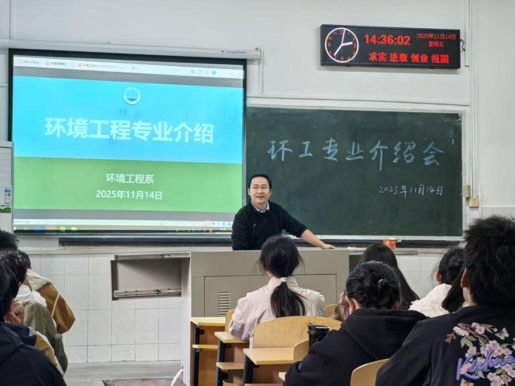 11月14日,环工系主任朱米家老师详细讲解了环境工程专业的核心课程体系、工程教育认证成果及未来发展方向。他特别介绍了毕业生可考取的各类从业资格证书,为学生提供实用的职业发展参考。周建军老师则结合行业趋势,展示了环工专业广阔的就业前景,并勉励同学们夯实基础,为未来的科研或职场之路做好充分准备。