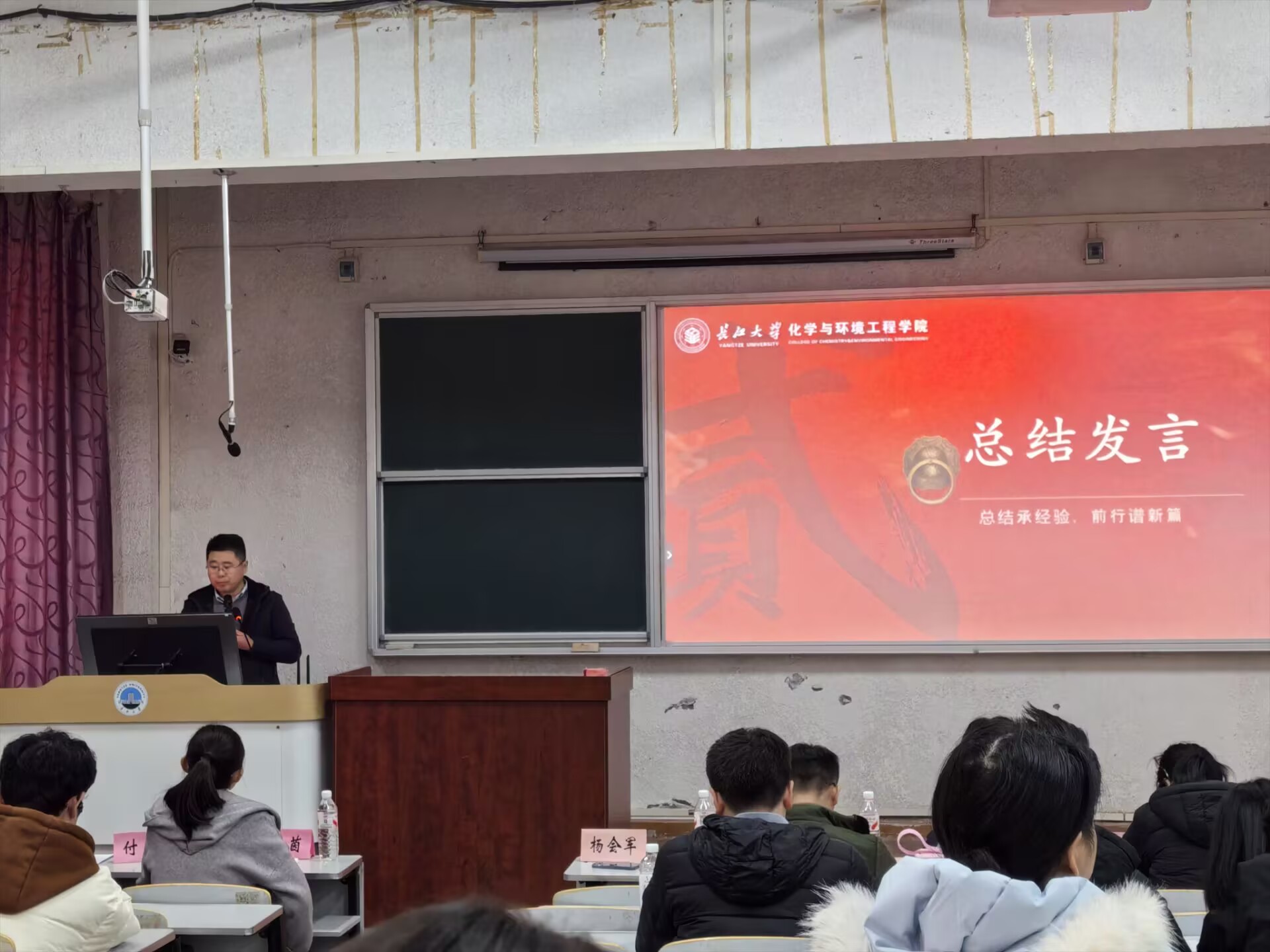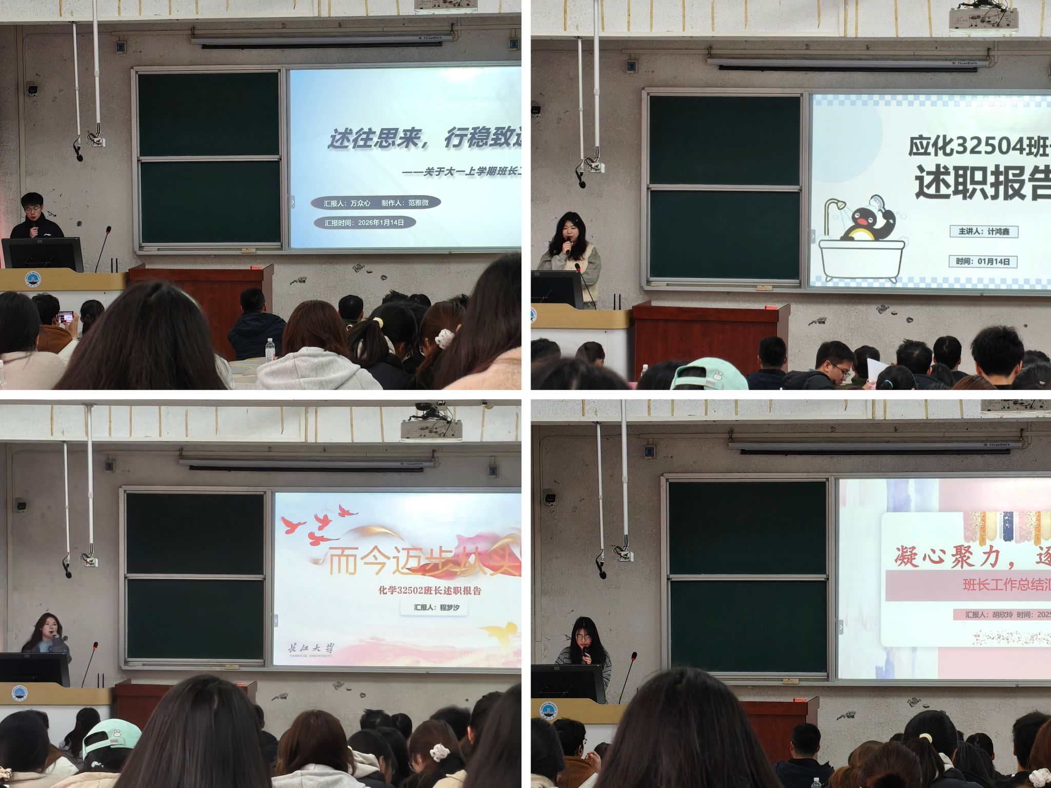 在述职环节,2025级各班班长依次登台,围绕班级基本情况、日常管理、存在问题及未来规划四个方面进行汇报。大家准备充分、条理清晰、态度诚恳,既展示了班级在思想引领、学业促进、活动组织等方面的特色做法和扎实成效,也坦诚剖析了工作中存在的短板,并提出了切实可行的改进思路,充分展现了化工学子务实担当、锐意进取的良好风貌。