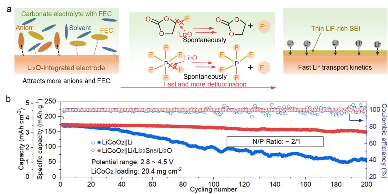 10月8日,a片漫画-a片漫画官方网址入口 肖围教授课题组在高性能锂金属电池领域取得重要研究进展,其成果"Li2O-Integrated Electrodes Enabling Enhanced Adsorption/Defluorination Kinetics toward LiF-Rich Interphase for High-Performance Lithium Metal Batteries"发表于国际顶级学术期刊Advanced Functional Materials。该研究创新性地通过电极设计,集成对碳酸酯电解液中含氟组分吸附/去氟化能力强的纳米氧化物,在金属锂电极表面原位构筑了化学/电化学稳定的含氟保护层,改善了锂金属负极的电化学性能。李国成博士为论文第一作者,肖围教授为论文第一通讯作者,a片漫画 为论文通讯第一单位。 内容简述: 锂金属负极因其极低的氧化还原电位和极高的理论比容量,被视为下一代高能量密度电池的理想选择。然而,其实际应用受限于较差的循环稳定性,主要归因于与碳酸酯电解液的高反应性。这种反应导致形成不稳定的固体电解质界面(SEI),在循环过程中易破裂,持续消耗活性锂和电解液。同时,天然SEI在组成、形貌和离子导率上的不均匀性会引发锂离子通量分布不均和成核位点杂乱,进而导致枝晶生长和电池短路。构建稳定均一的SEI层成为抑制副反应和枝晶问题的关键。研究发现,富含LiF等无机成分的SEI可有效提升界面稳定性。现有策略(如高浓度电解液、添加剂和表面修饰)主要通过调控电解液组成或界面化学来促进含氟物种分解生成LiF,但往往依赖复杂配方或精密工艺。相比之下,从电极设计入手,开发能高效吸附并促进含氟组分去氟化的新方法,为构建稳定富LiF界面提供了更具潜力的替代路径。 本研究提出了一种通过调控复合电极对含氟电解质组分的吸附与去氟化动力学,以定向构筑富LiF界面的新策略。采用机械化学方法,在Li/Li22Sn5复合电极中实现了Li2O纳米颗粒的原位、均匀嵌入。研究表明,Li2O对PF6⁻和氟代碳酸亚乙酯(FEC)具有强吸附能力,可加速其自发去氟化过程,进而引导形成以阴离子/FEC衍生物为主的富LiF 固体电解质界面。结合光谱学表征与理论计算,证实了Li22Sn5表面对含氟物种具有优先吸附与去氟化促进作用具有优先吸附与去氟化促进作用,揭示了该界面结构的形成机制。同时,稳定的Li22Sn5合金骨架有助于引导均匀锂沉积并缓冲体积变化,与Li2O协同增强电极稳定性。该复合负极在碳酸酯电解液中实现50次循环内平均库仑效率99.0%。与LiCoO2正极组装的完整电池在苛刻条件(N/P = 2:1,贫电解液20 μL)下表现出优异的循环稳定性,面容量为3.3 mAh cm⁻2,200周后容量保持率达87.0%;180 mAh软包电池在100次循环后仍保持78.2%的容量,充分证明了该电极设计策略的实际应用潜力。 该研究工作得到了国家自然科学基金(52272207和52274292)、北京自然科学基金(2192029)、湖北省杰出青年基金(2020CFA090)等项目的支持。 图文摘要: 图(a)Li/Li22Sn5/Li2O电极吸附/去氟化构筑富含LiF固态电解质界面层示意图;(b)LiCoO2||Li/Li22Sn5/Li2O、LiCoO2||Li电池循环性能对比图。 文章链接://advanced.onlinelibrary.wiley.com/doi/epdf/10.1002/adfm.202523194 (审核:肖围 编辑:常艳玲)